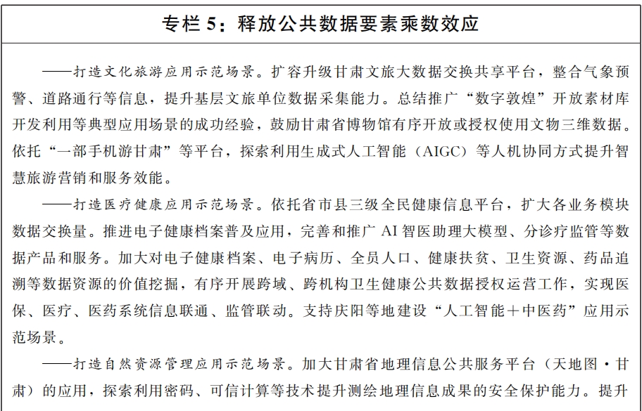(五)有序開展公共數據授權運營。根據國家相關規定,適時制定甘肅省公共數據資源授權運營管理規定,探索整體授權、分領域授權、依場景授權等多種授權運營模式。遴選、培育具備高水平數據運營技術、安全保障能力、應用示范效應的行業性、區域性公共數據運營機構。推動建設公共數據授權運營平臺,確保數據資源開發利用過程可管、可控、可追溯。率先在文化旅游、醫療健康、自然資源、交通物流、生物醫藥、現代農業、能源化工、氣象服務等數據資源豐富、應用需求廣泛的重點行業和領域,打造一批公共數據產品和服務。
