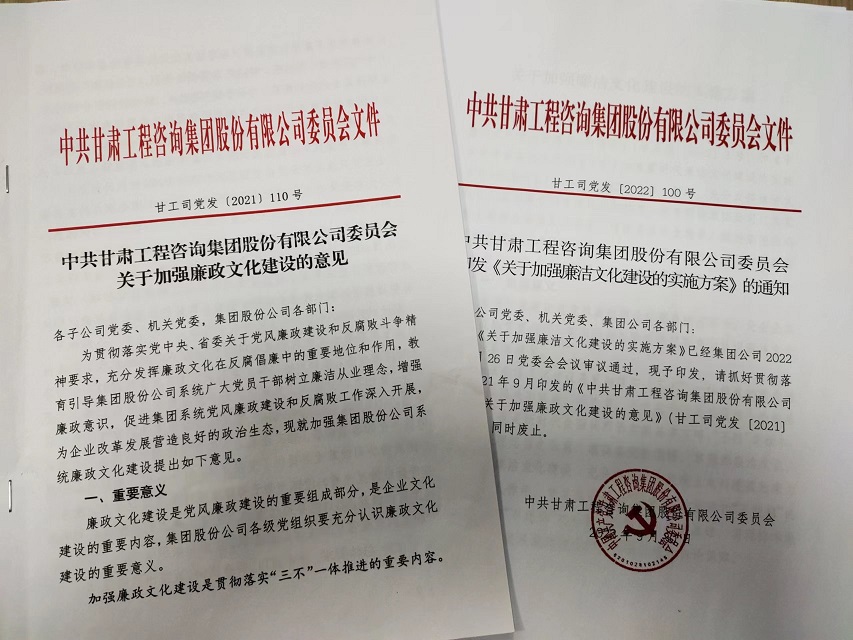 作為新組建的產業集團,甘肅工程咨詢集團把資產整合、產業耦合和文化融合作為集團公司組建的重要內容,其中讓廉潔文化建設在企業文化建設中先行一步,早安排早部署,2021年9月集團公司黨委研究印發《關于加強廉政文化建設的意見》,在中共中央辦公廳《關于加強新時代廉潔文化建設的意見》和省委《實施方案》印發后,又及時對標、查缺補漏,2022年9月修訂印發《關于加強廉潔文化建設的實施方案》,為新時代集團公司加強廉潔文化建設提供了指導。自組建以來,集團公司廉潔文化建設力求在“內化于心”上下功夫,在“外化于行”上求實效,引導干部職工廉潔從業,廉潔用權,積極營造“崇廉、尚廉、倡廉、守廉”的企業風尚和發展氛圍。