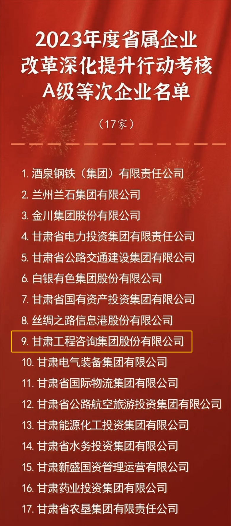 根據(jù)《2023年全省國企改革深化提升行動考核評估工作方案》,2023年度省屬企業(yè)改革深化提升行動考核結(jié)果已經(jīng)省政府國資委主任辦公會審議通過。A級等次企業(yè)名單如下: