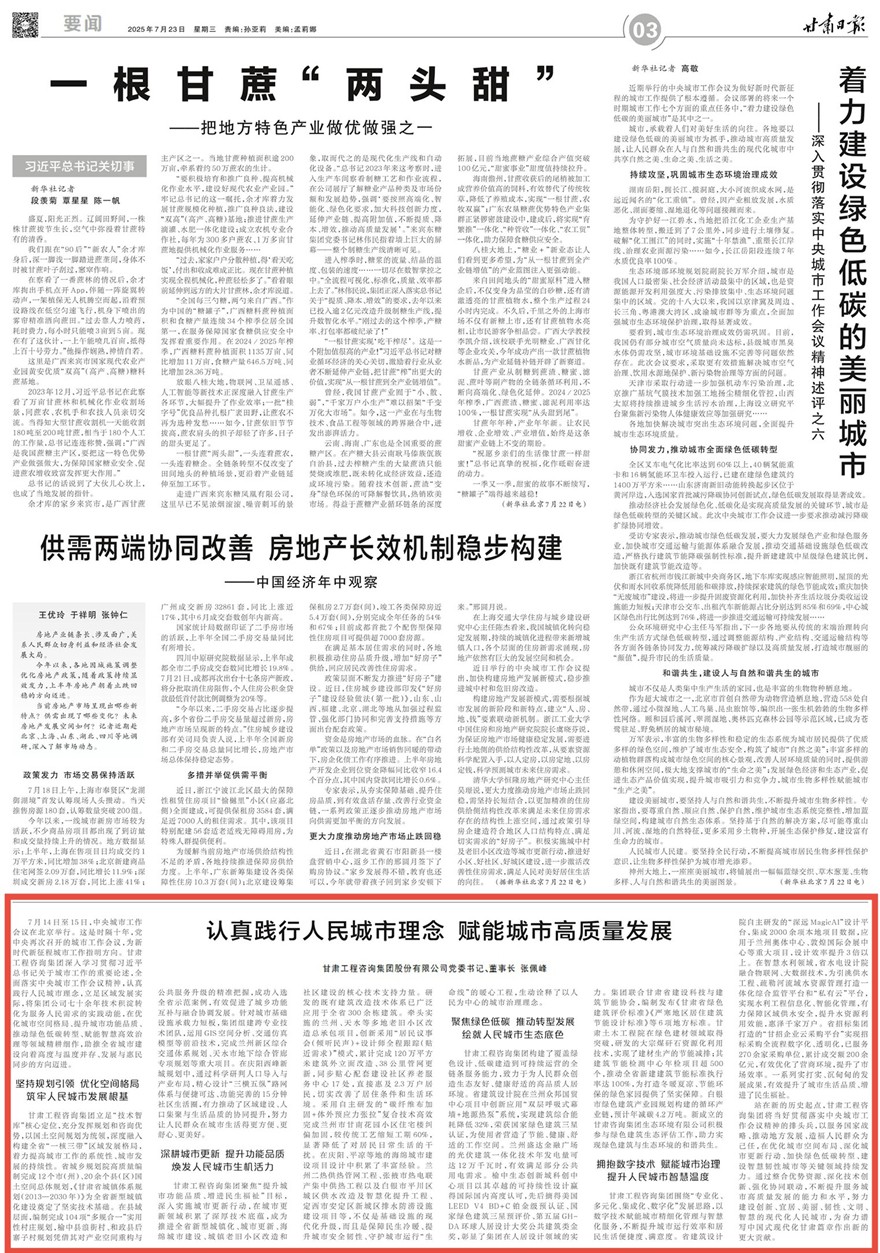 7月14日至15日,中央城市工作會議在北京舉行。這是時隔十年,黨中央再次召開的城市工作會議,為新時代新征程城市工作指明方向。甘肅工程咨詢集團深入學習貫徹習近平總書記關于城市工作的重要論述,全面落實中央城市工作會議精神,認真踐行人民城市理念,立足區(qū)域發(fā)展實際,將集團公司七十余年技術積淀轉化為服務人民需求的實踐動能,在優(yōu)化城市空間格局、提升城市功能品質、推動綠色低碳轉型、賦能智慧高效治理等領域精耕細作,助推全省城市建設向著高度與溫度并存、發(fā)展與惠民同步的方向邁進。