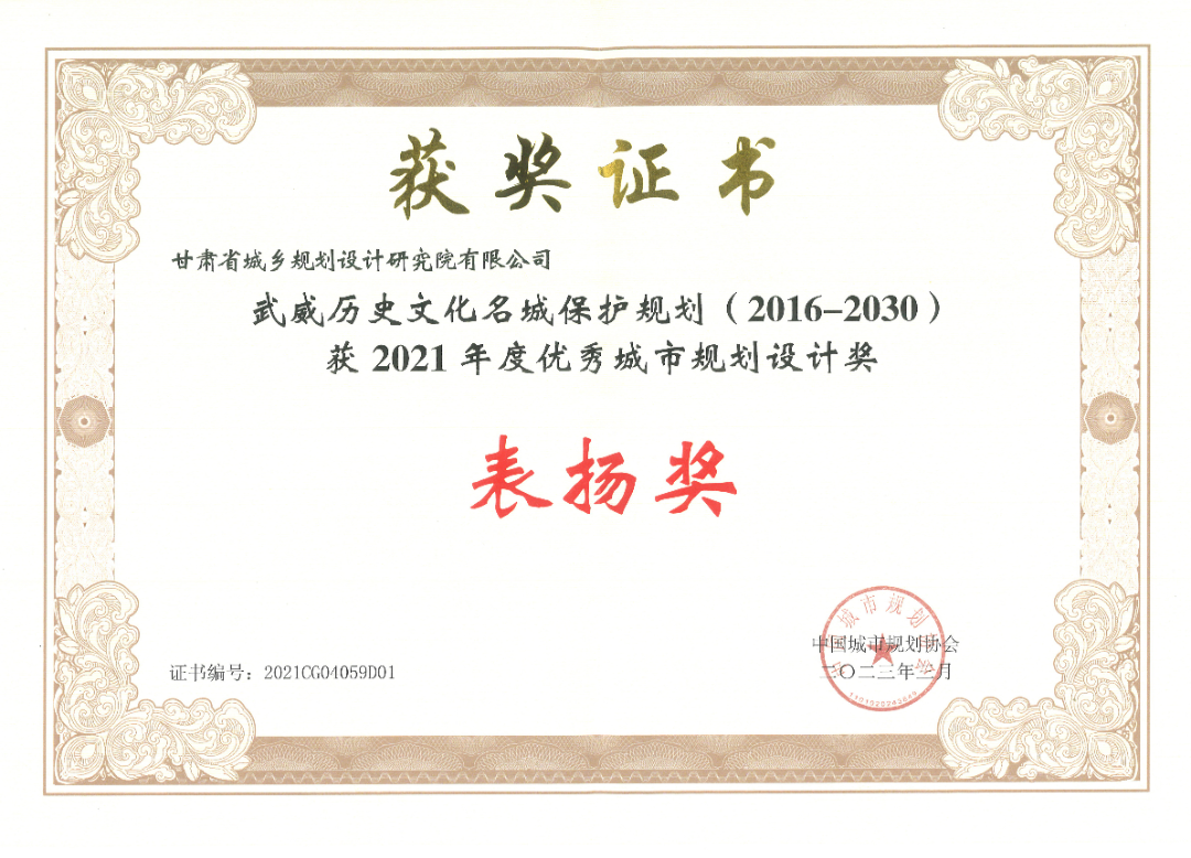 近期,由省規劃設計院編制的《武威歷史文化名城保護規劃(2016-2030)》項目榮獲全國“2021年度優秀城市規劃設計獎”表揚獎,為我省歷史文化名城保護專業類唯一獲獎項目。