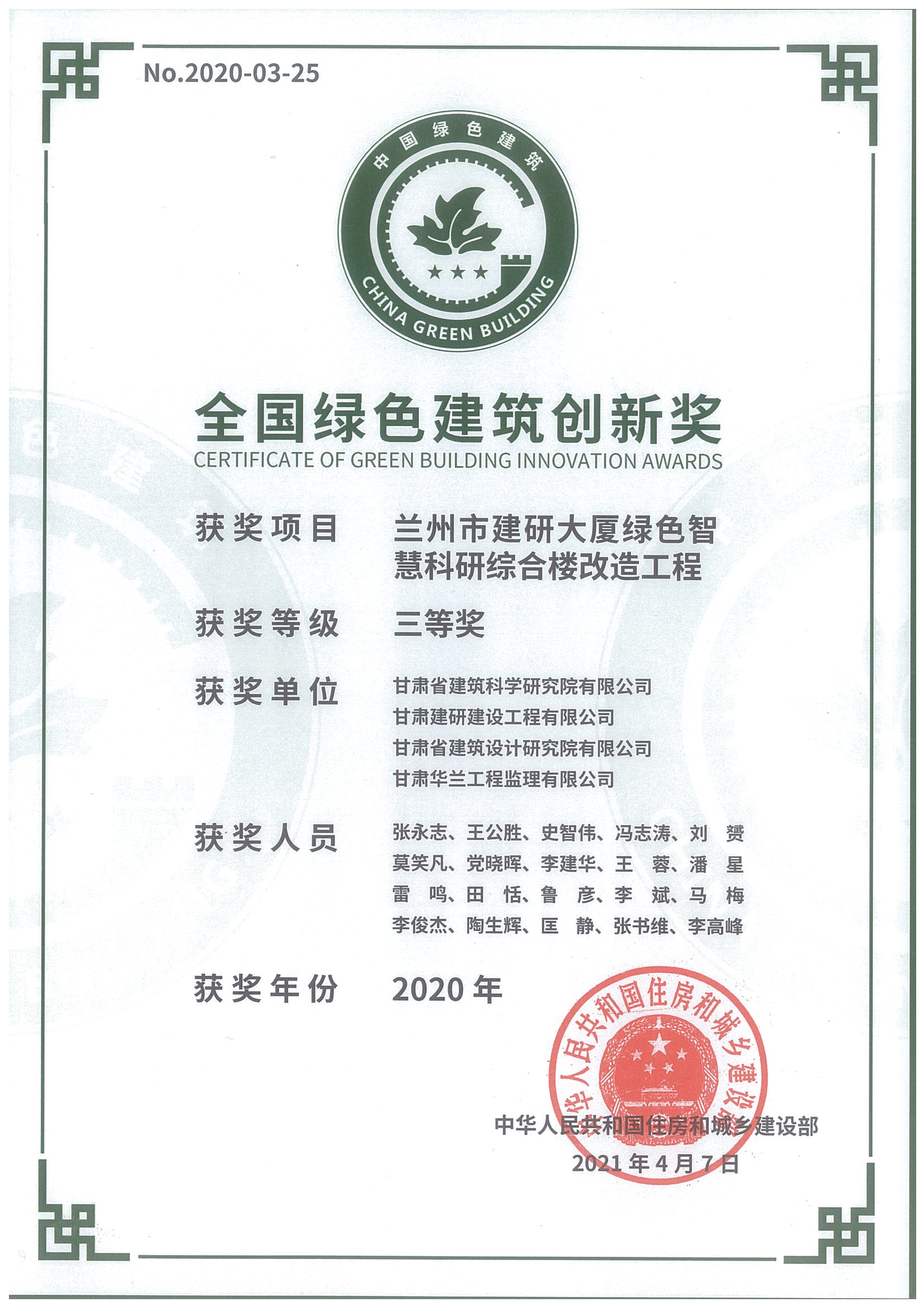 全國綠色建筑創(chuàng)新獎(jiǎng)(蘭州市建研大廈綠色智慧科研綜合樓改造工程)