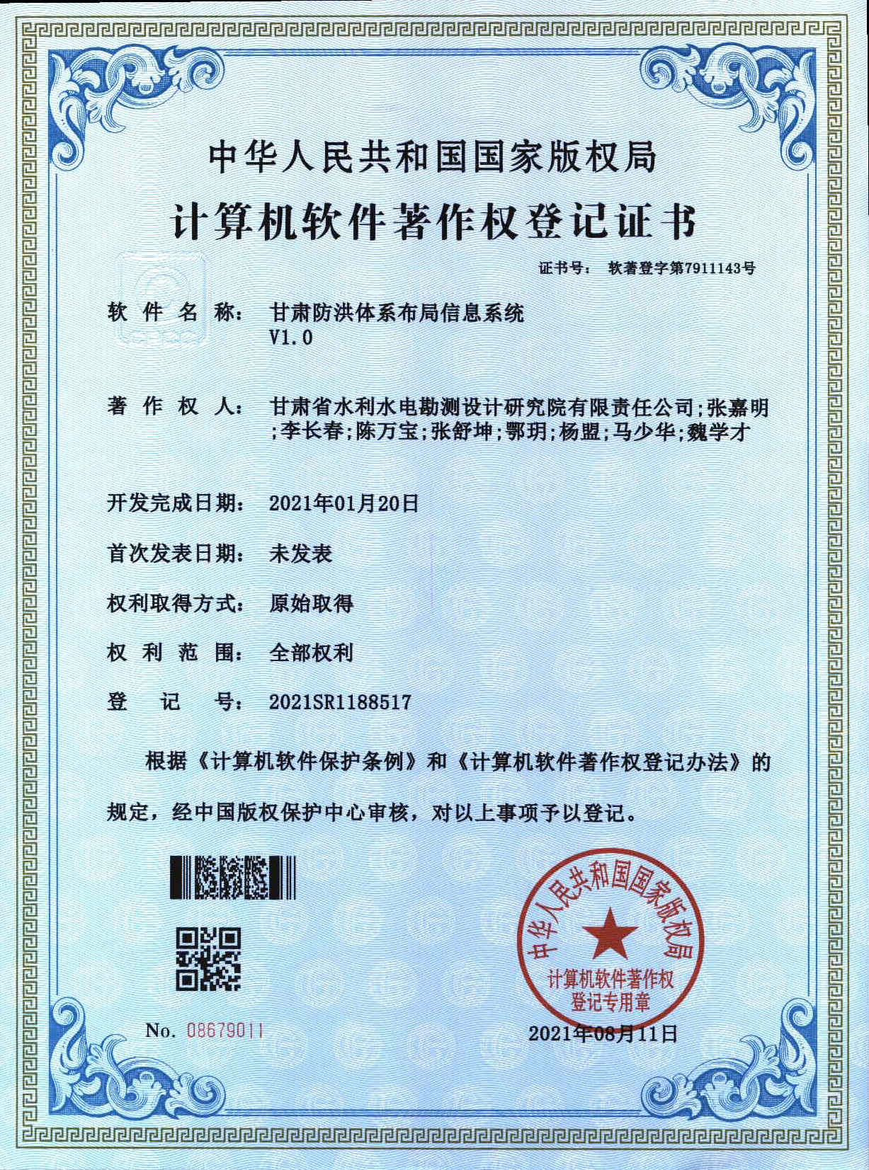 軟著登記證書——甘肅防洪體系布局信息系統